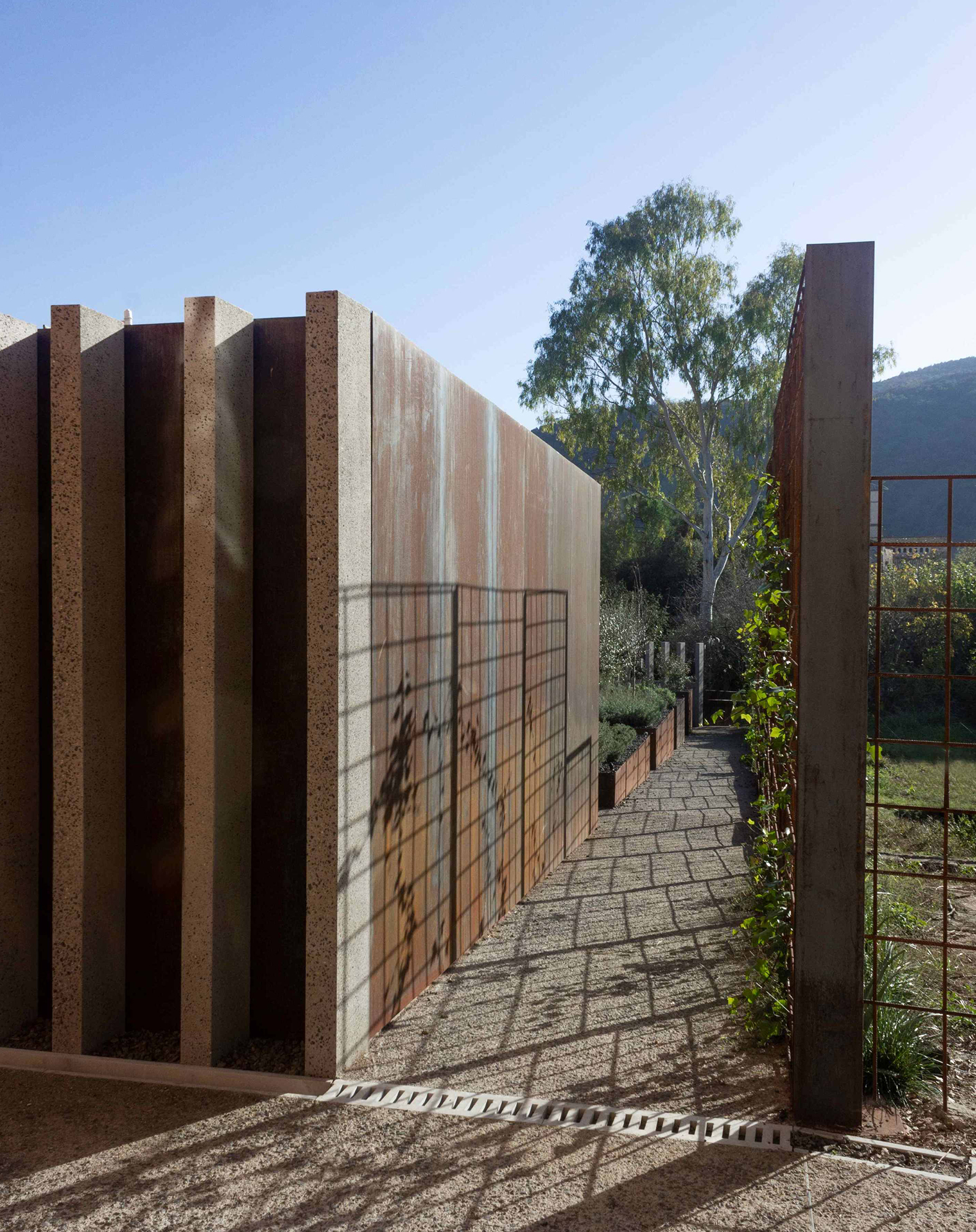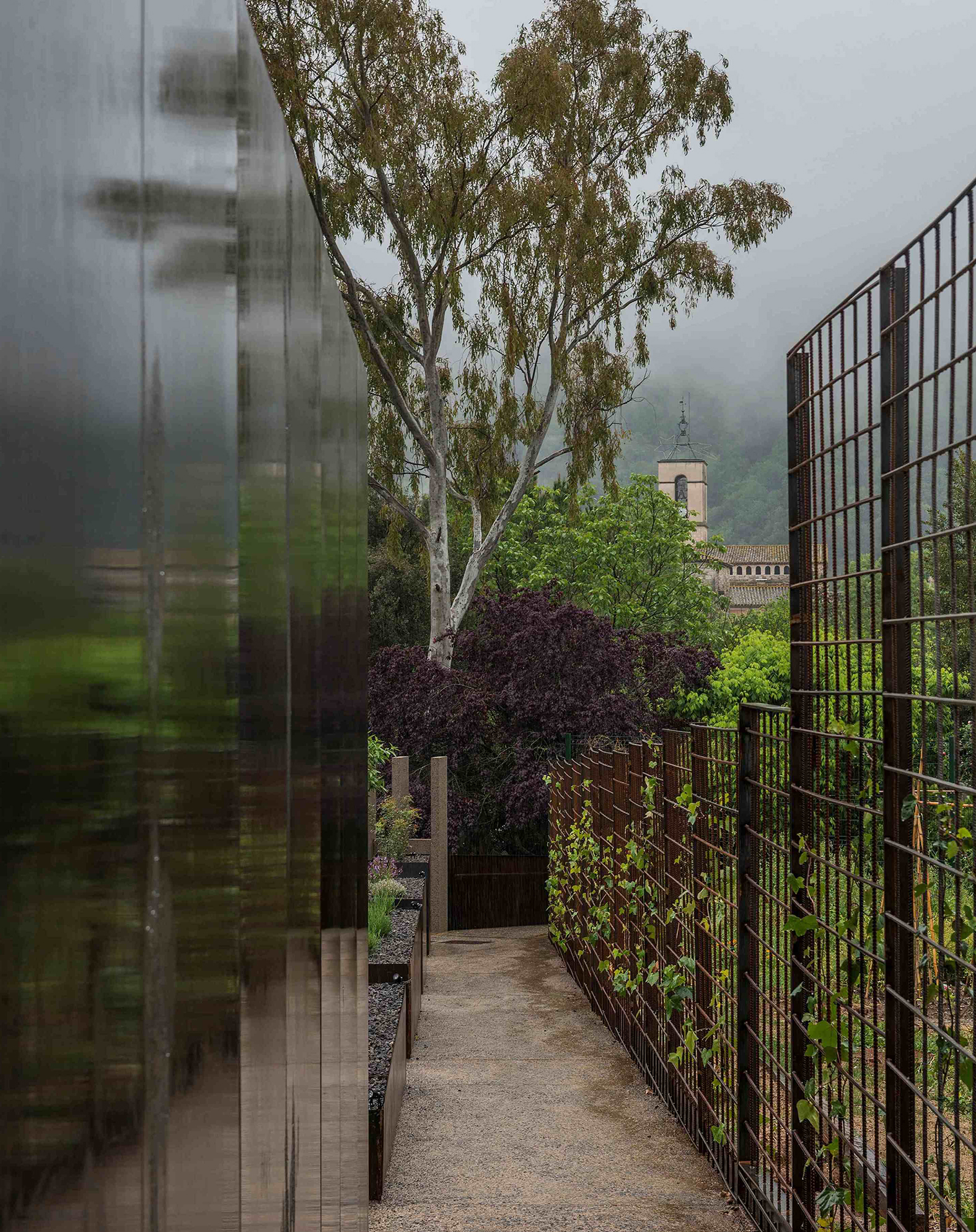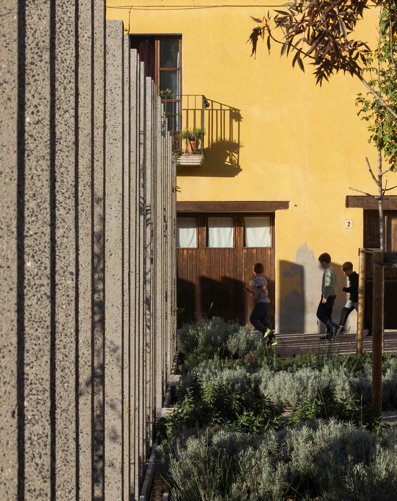 La plaza se entiende como la abstracción de los huertos que se generan en el entorno del canal de riego y se propone una composición ordenada a partir de varios elementos con texturas diferenciadas según su uso.